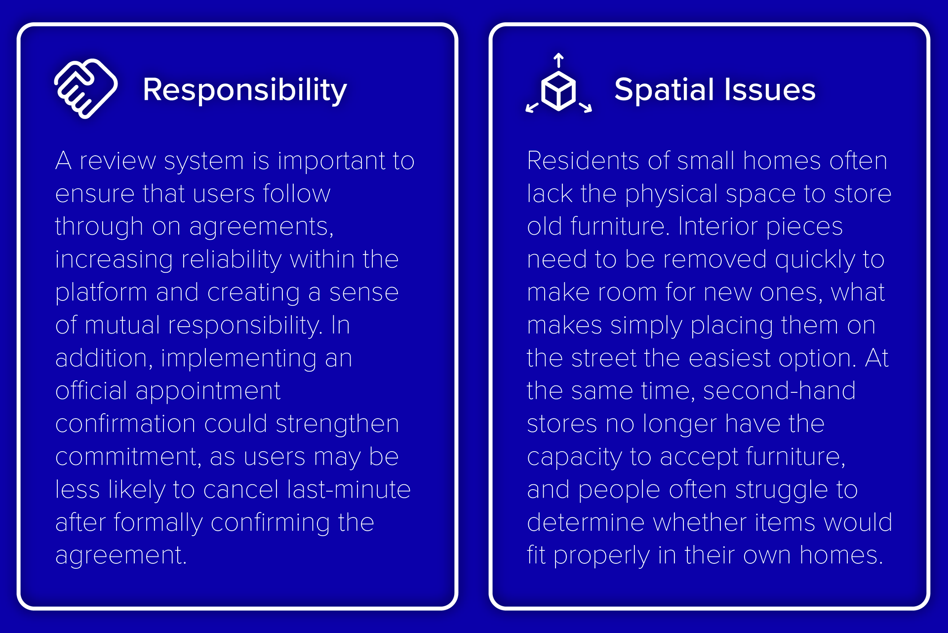 The analysis showed that none of the current alternatives match the convenience of bulky waste disposal. No existing solution allows users to get rid of furniture as quickly and effortlessly. Although some platforms come close, they lack usability and do not help users make quick and confident decisions.